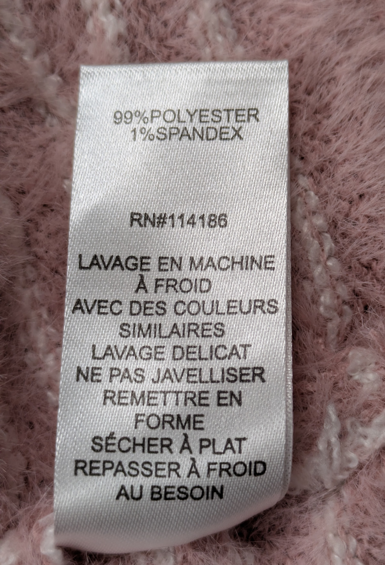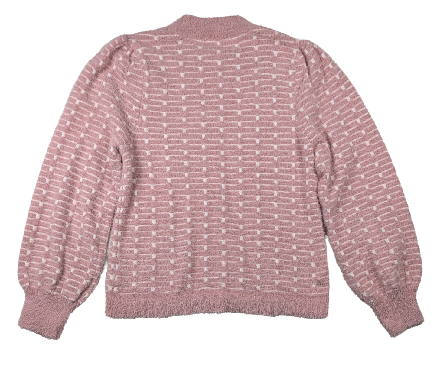 Stay cozy and stylish in the 89th & Madison Fuzzy Pink Sweater with Puffy Sleeves. The soft, fuzzy material in a playful pink color will keep you warm and looking trendy. The unique white geometric design adds a touch of quirkiness to this size Large sweater.