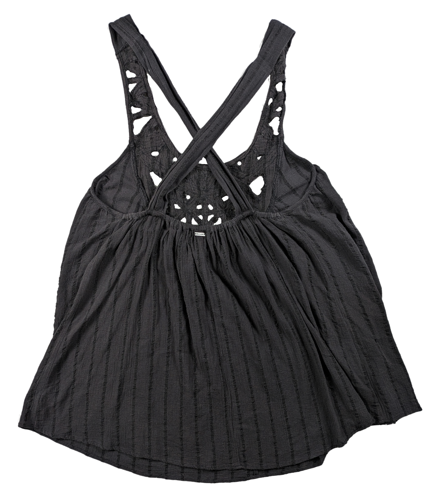 Unleash your inner rebel with the Billabong Black Swing Tank. Featuring edgy cut-outs and criss cross straps, this tank proves that black is anything but basic. Made from lightweight gauze, it's perfect for hot summer days. Who says you can't be cool and comfortable at the same time? Size Medium.