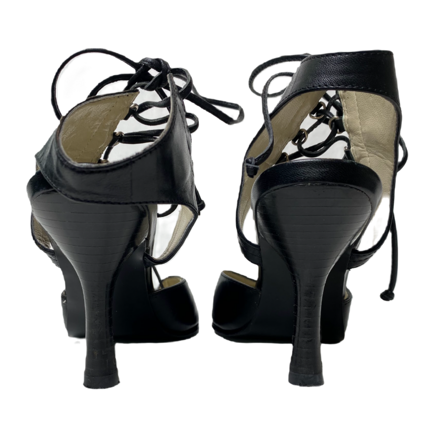Step into style with Carlos Santana's "Lacy" heels. These black leather beauties feature a pointed toe and straps that wrap around the ankle and tie for a unique touch. Perfect for adding a hint of edgy elegance to any outfit.