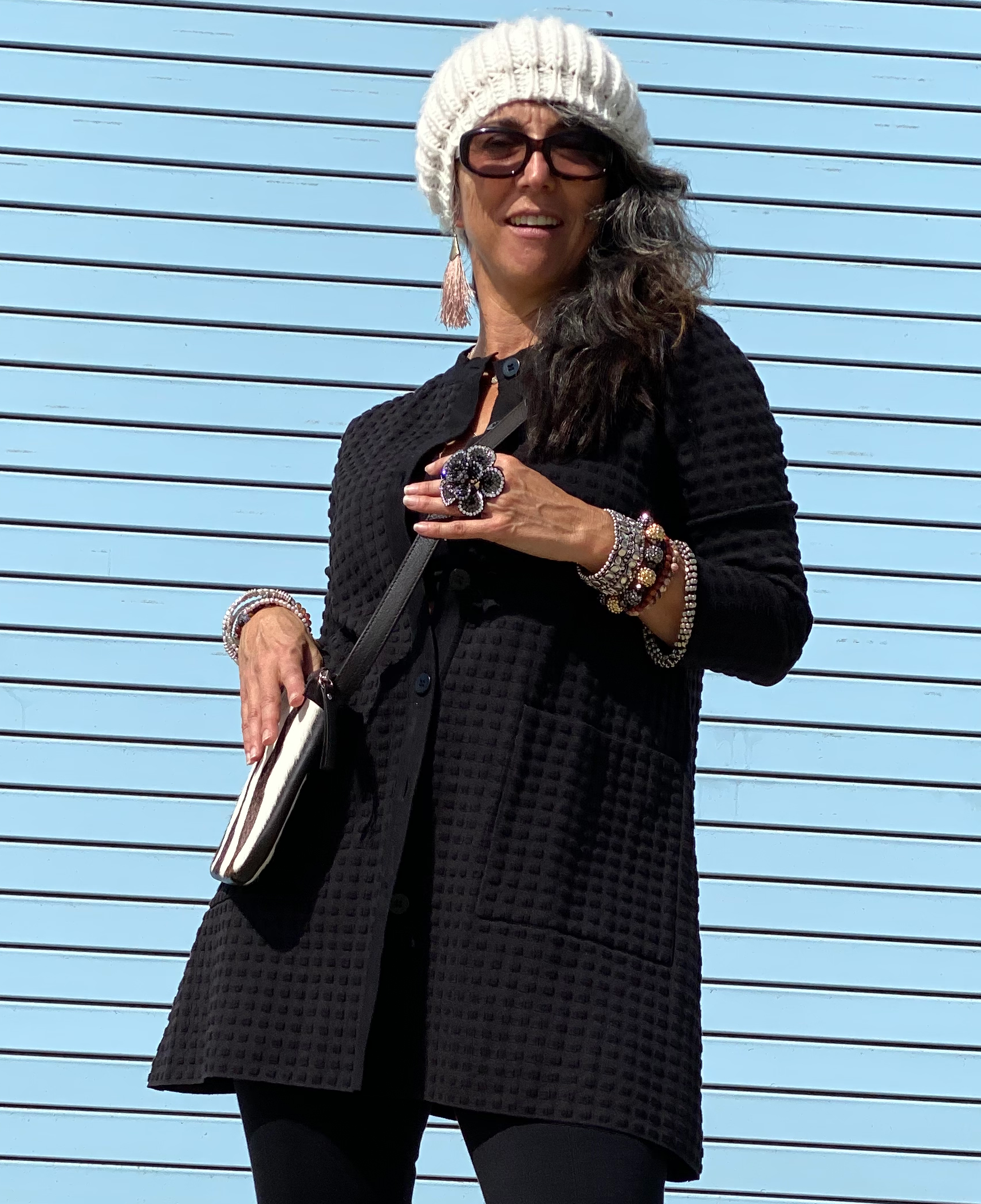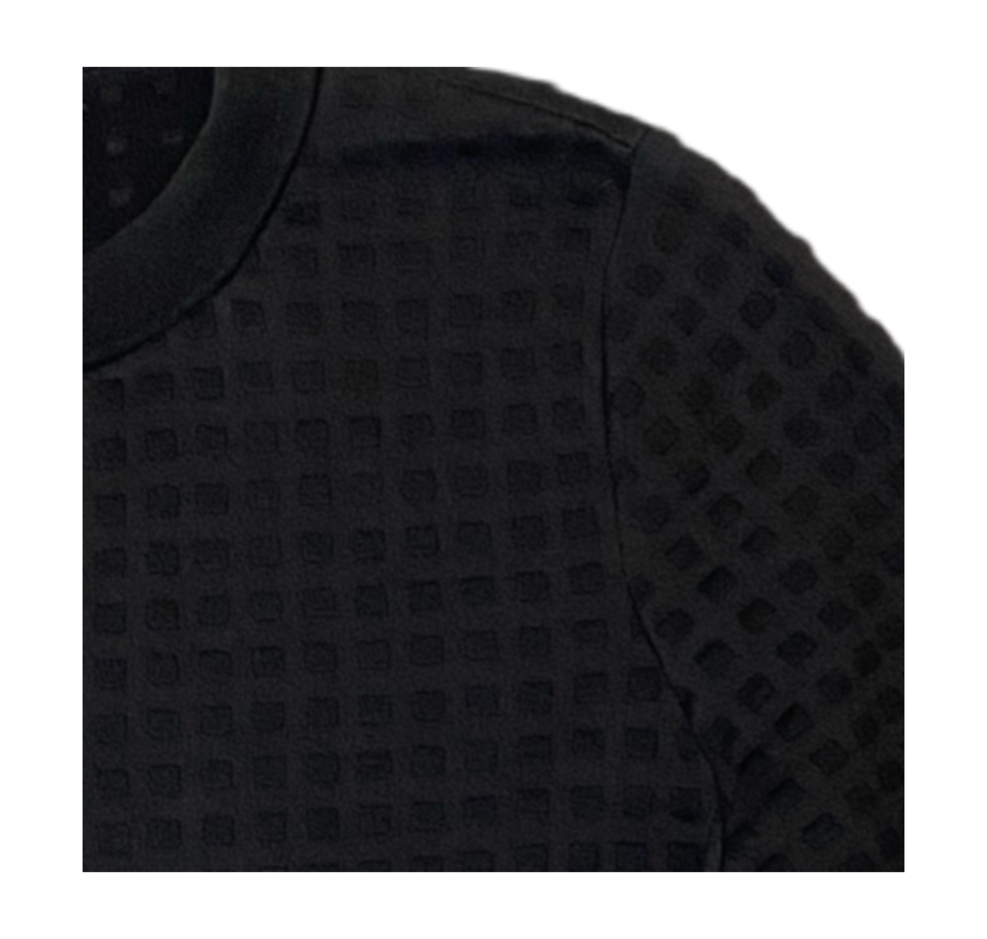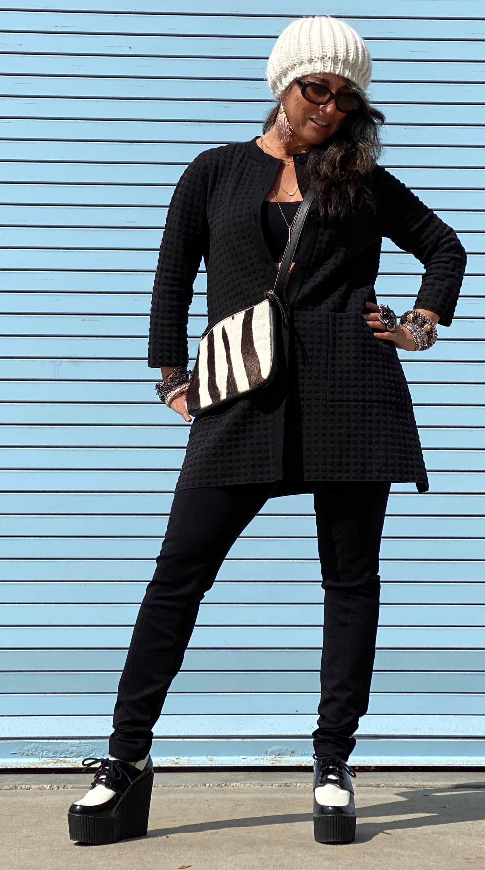 Get ready to make a statement with the COS Black Button Front Window Pane Textured Jacket with a timeless a-line silhouette. This unique jacket features a playful window pane texture woven into a soft knit cotton/poly fabric for ultimate comfort. With its 3/4 sleeves and button front, it's the perfect addition to any wardrobe. Available in size XS. So versatile, you'll want to wear it everywhere! 🙌
