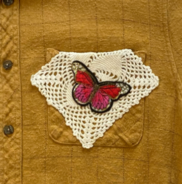 REFRESHED - Mustard HUF Flannel with Vintage Crochet Lace, Floral and Butterfly Appliques.