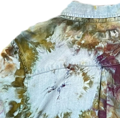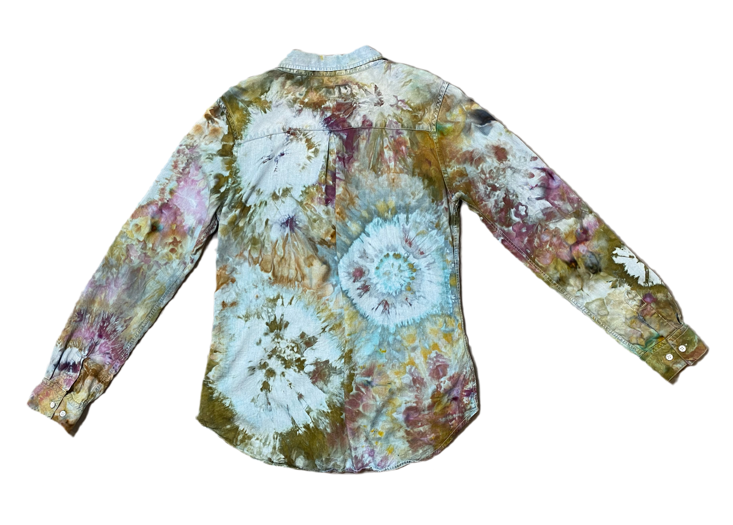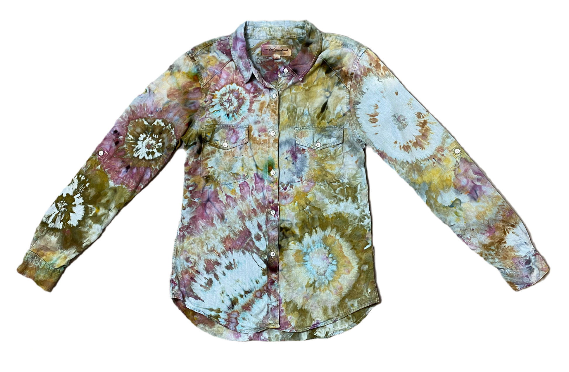 Refreshed - Custom hand dyed Young Hearts Run Free button front rayon blouse.