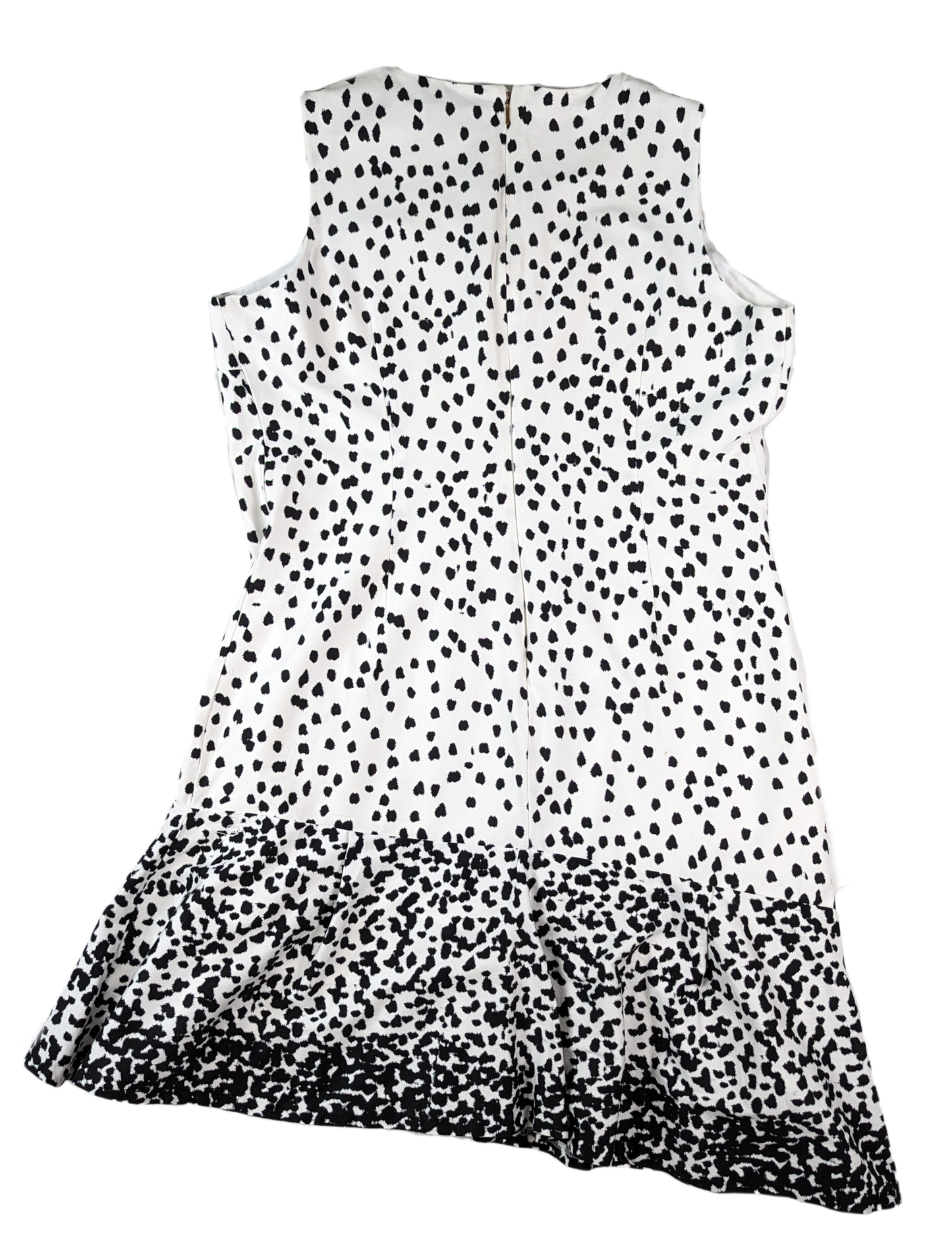 Donna Karan Sleeveless Black and White Dress with Polka Dots and Asymmetrical Hem.vA painterly Dalmatian dot print patterns this sleeveless dress, with an ombré dot finish and asymmetric hemline adding flair to the silhouette. Round neck, sleeveless and concealed back zip closure. Fully lined.
