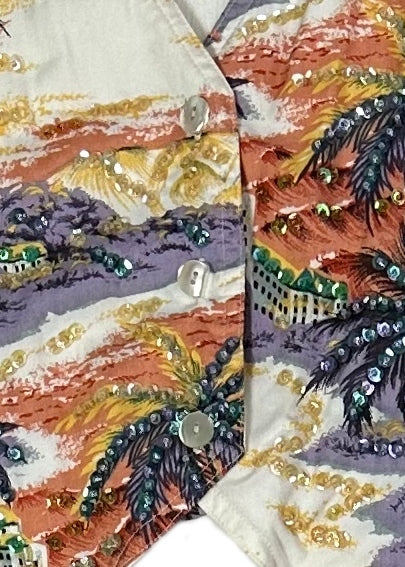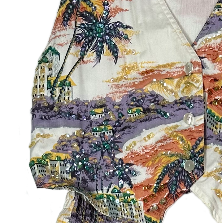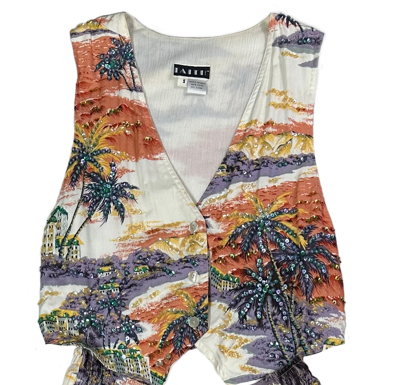 This Faith long tiered skirt with vest with sequins is the perfect ensemble for any summer day. The set features a tropical print skirt and an adjustable vest with sequins for a subtle but eye-catching sparkle. Fabric is lightweight and comfortable, ensuring you can stay cool even in the heat.
