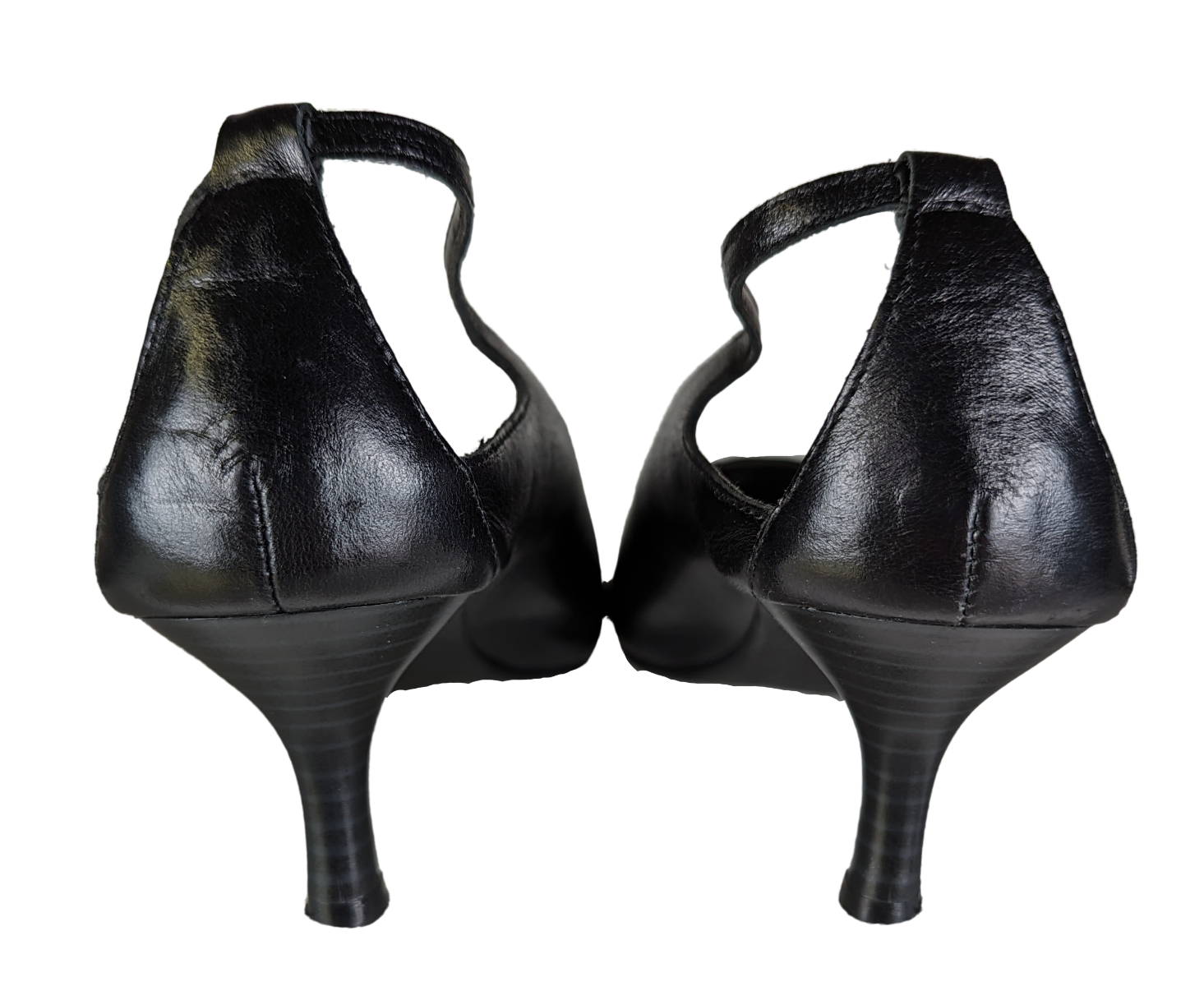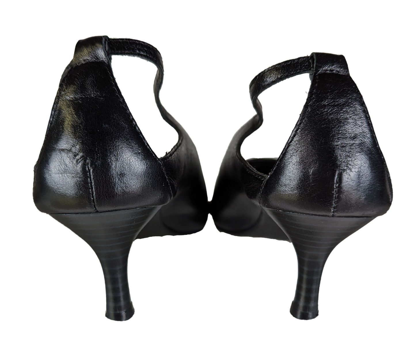 Step into style with these Harve Bernard Black Kitten Heels. Made of sleek black leather and featuring trendy cut outs, these heels are sure to turn heads. The kitten heels and sling back design combine fashion and comfort for the perfect look.