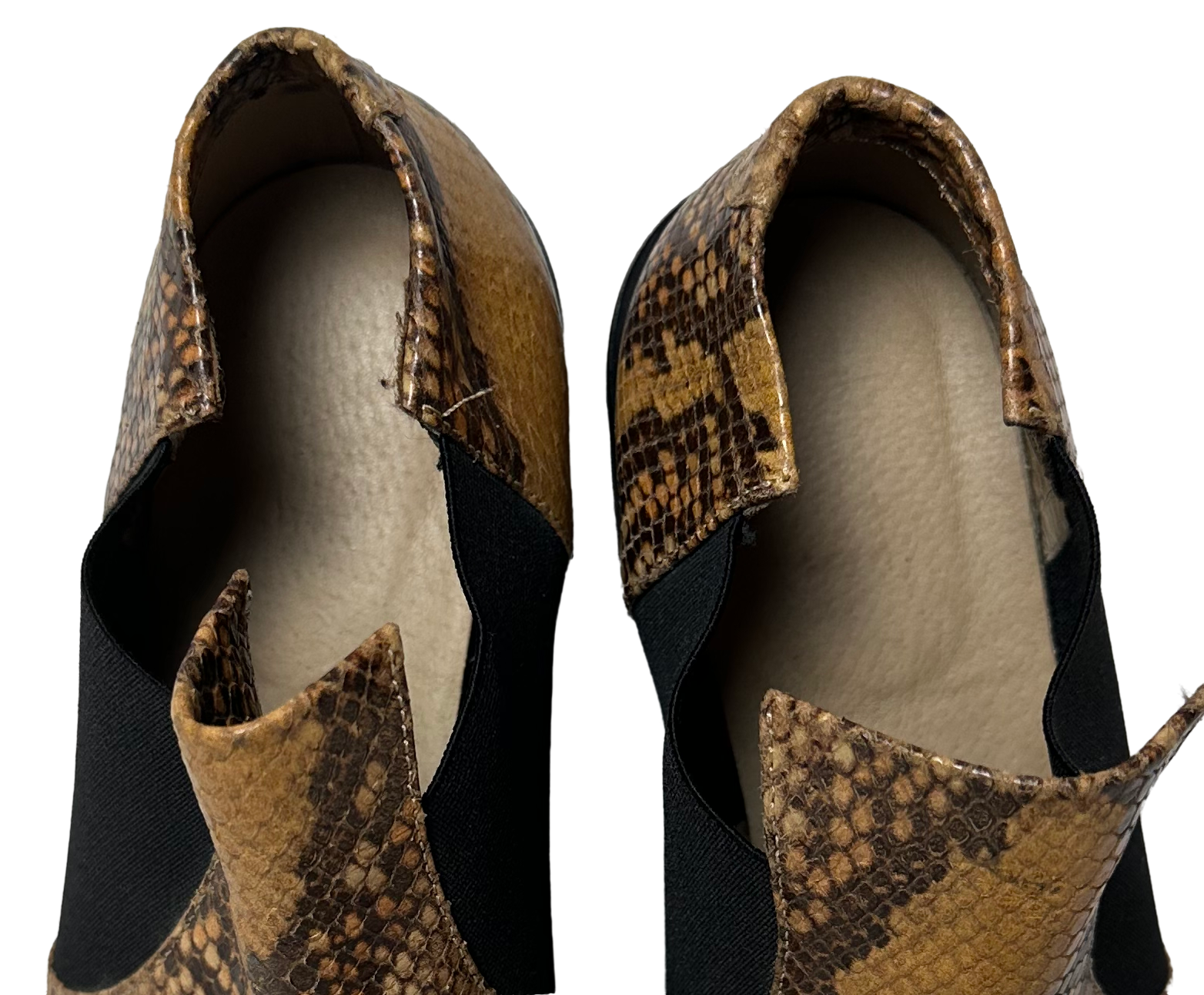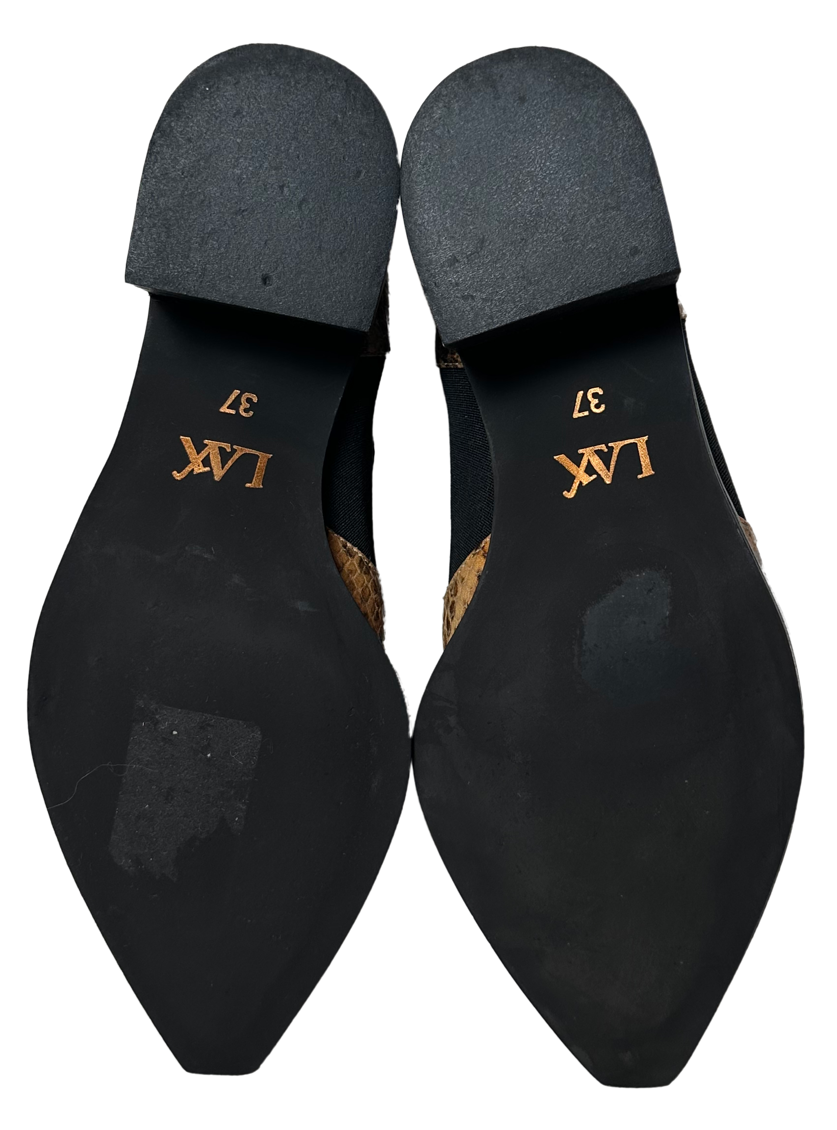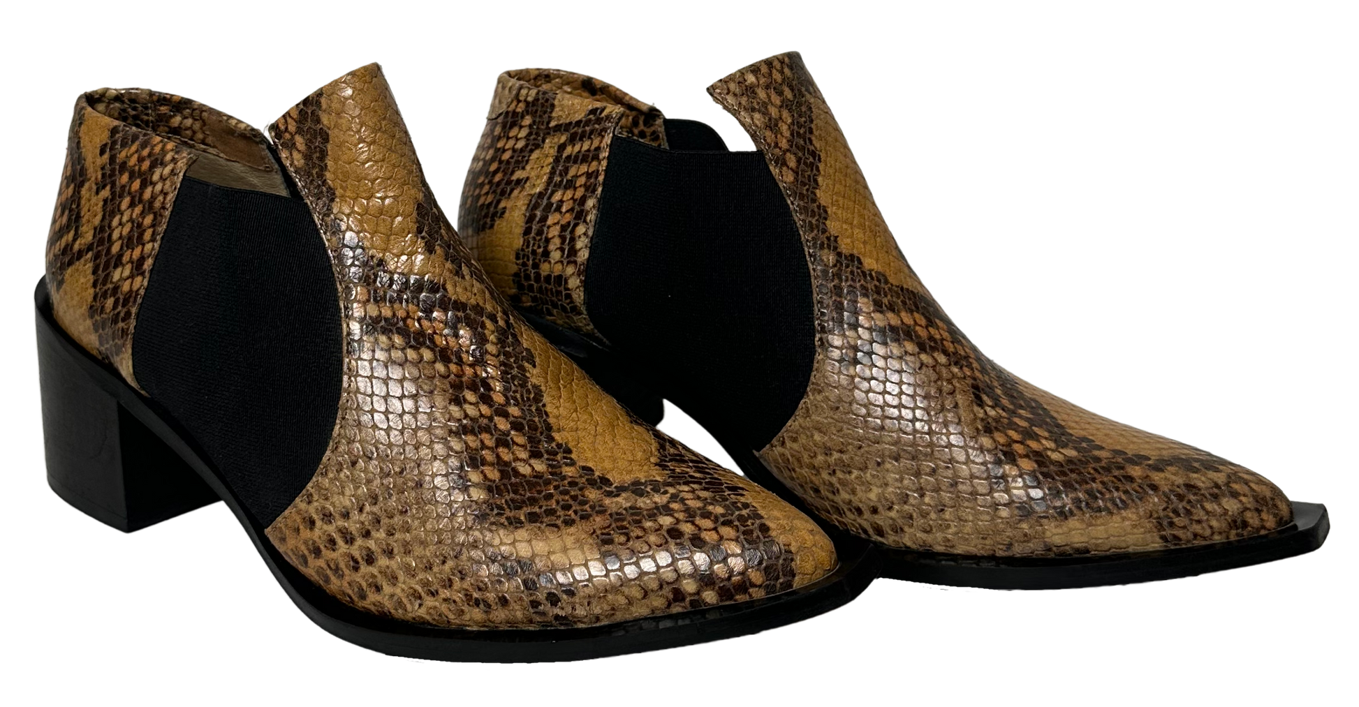 Step into fall with a playful edge in these LAX Brown Snake Skin Ankle Booties in excellent used condition. Featuring a trendy snake skin look and a chic pointed toe, they bring bold style to your outfit. The chunky 2 1/4 inch heel adds just the right lift for all your seasonal adventures, while slip-on ease and elastic sides keep comfort front and center. Perfect for pumpkin picking, cozy coffees, or weekend strolls—these boots are ready to join your autumn fun.