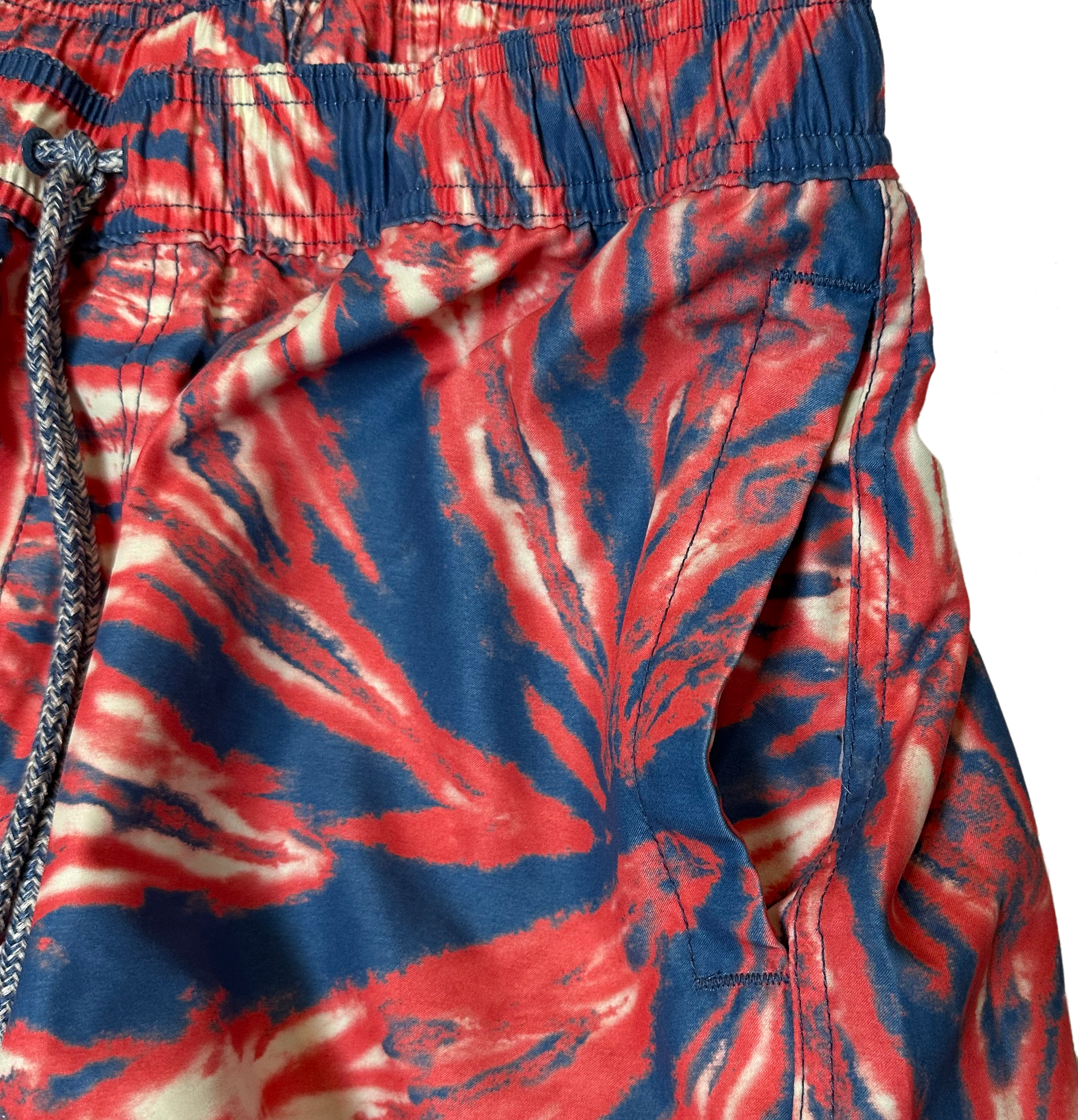 Get noticed at the beach with the Neff Tie Dye Swim Board Shorts! These psychedelic swim trunks feature pockets, elastic drawstring waist and a bold red, white, and blue pattern. Perfect for the playful and confident beachgoer in size M.