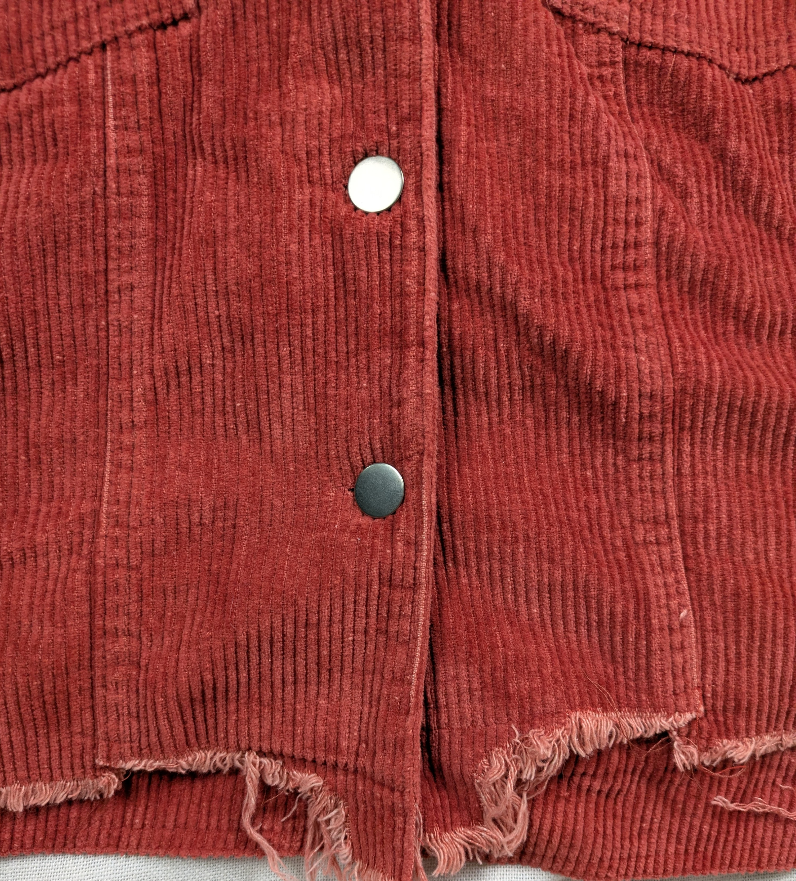 Get ready to stand out in this quirky and playful POL distressed wide corduroy jacket. The burnt orange color adds an unexpected pop while the distressed details give it a trendy edge. This trucker style jacket comes in size Small, making it the perfect addition to any stylish wardrobe.