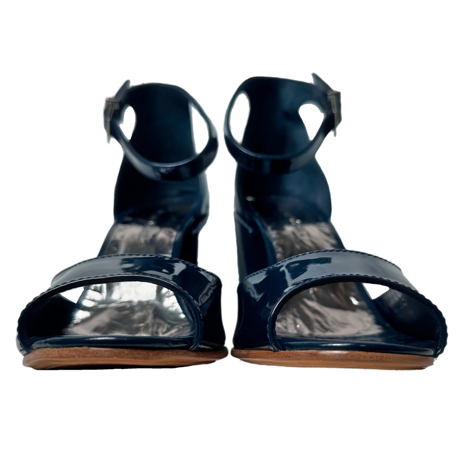 Take a stylish step forward in the Rachel Comey Teal Paten Leather Coppa Block Heels. The dark teal paten leather, ankle strap, and peep toe design offer a unique twist on a classic heel. Elevate any outfit with these quirky and playful heels.