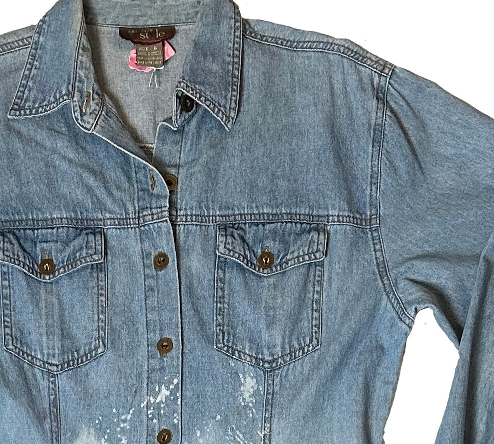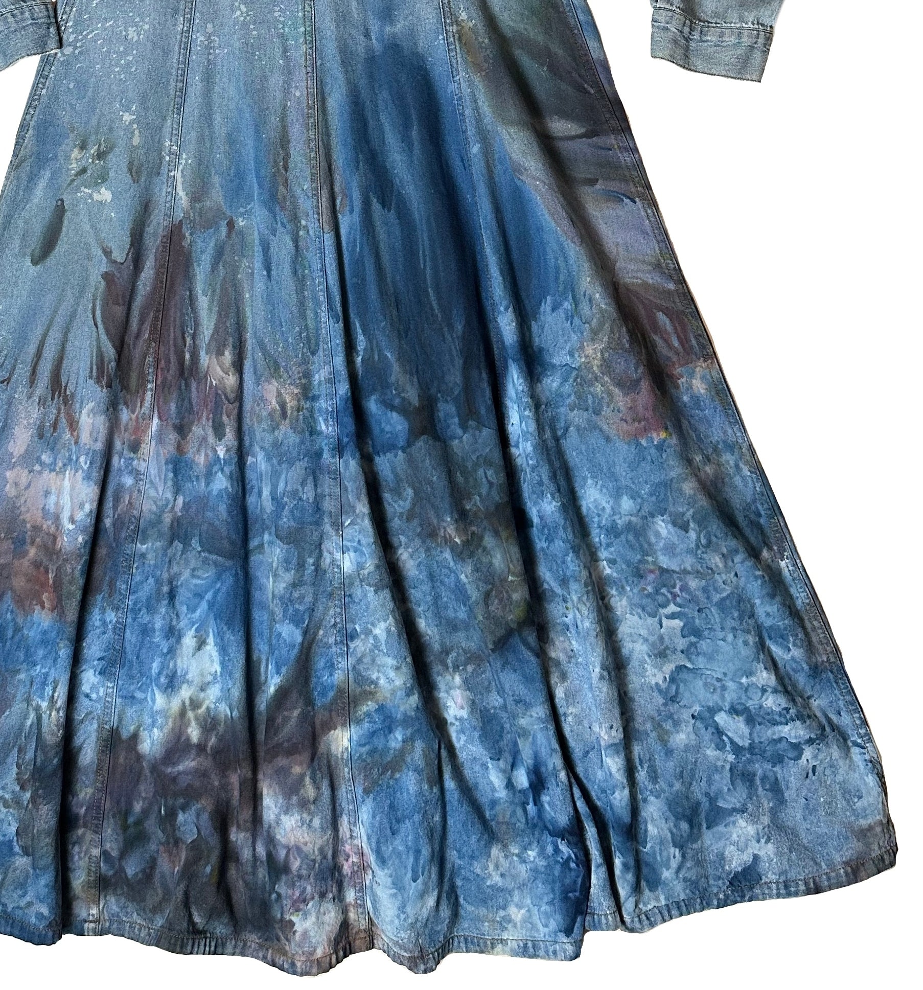 REFRESHED -New York Style Button Front Vintage Denim Shirt Dress Hand Dyed Cotton size 8. Elevate your wardrobe with our REFRESHED New York Style Button Front Vintage Denim Shirt Dress. Hand dyed in beautiful hues, this dress features a classic button front and long sleeves. Experience the perfect blend of vintage charm and modern style in a size 8 fit.