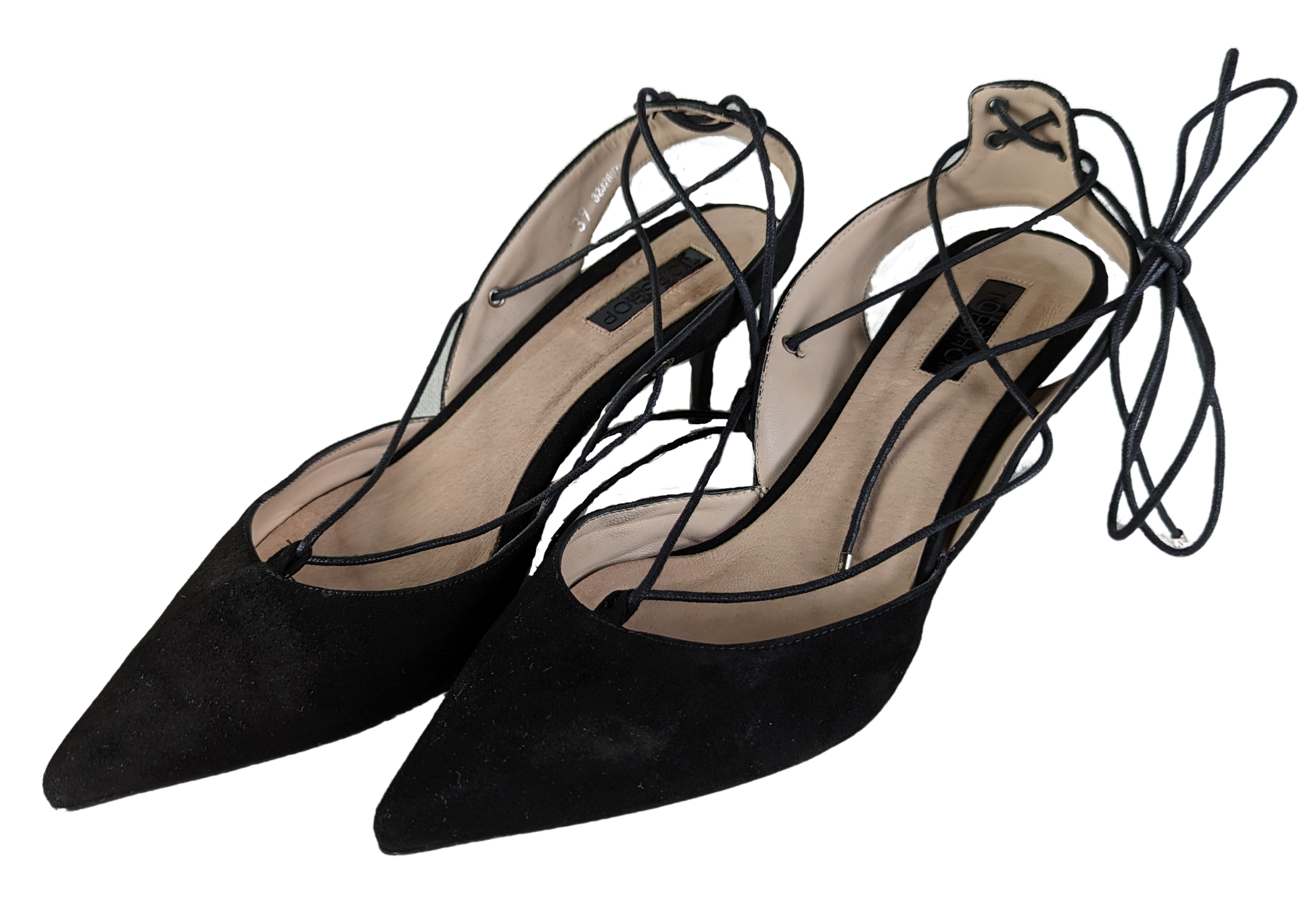 Upgrade your shoe game with TopShop Jupiter Black Lace-up Heels. These fierce heels feature a pointy toe and lace-up design, perfect for adding a touch of edge to any outfit. Made from luxurious suede, they're both trendy and comfortable. Walk tall in size 39 (8 1/2). It's time to put your best foot forward!
