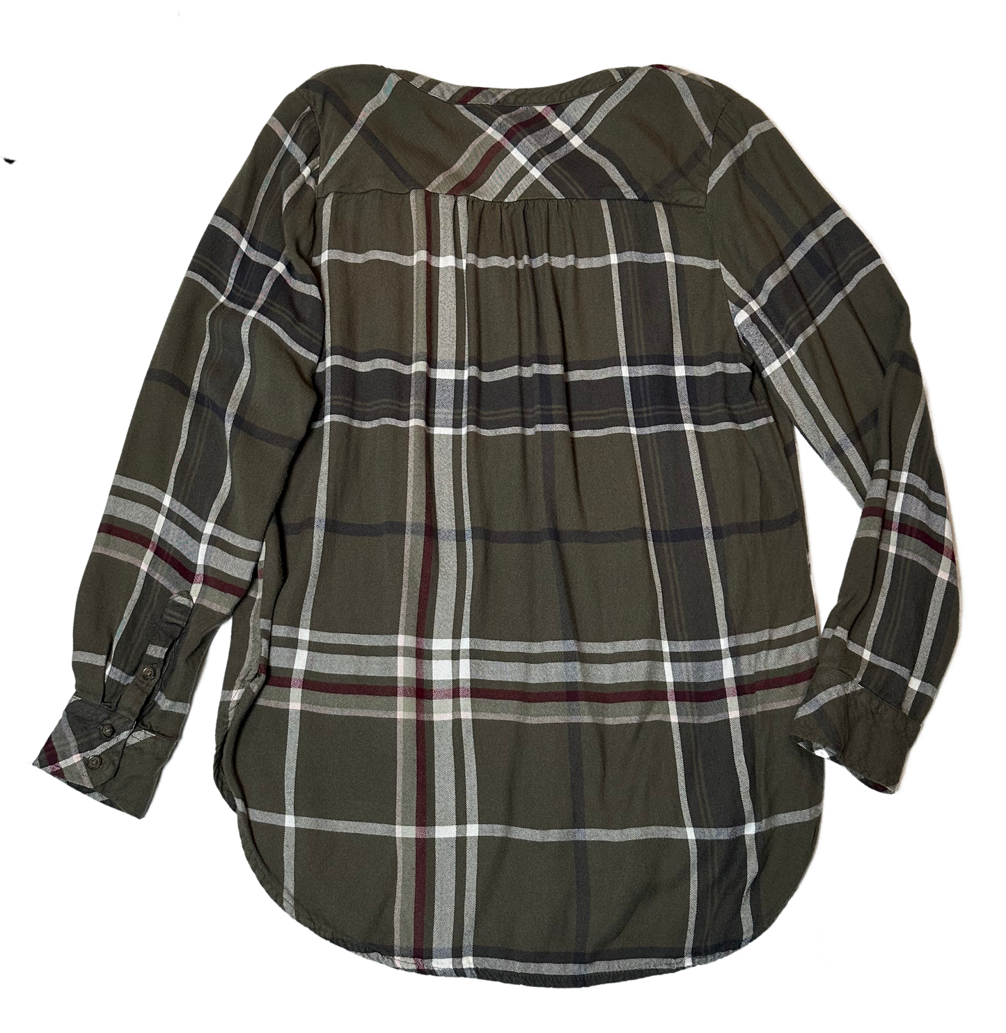 Stay cozy in this Universal Threads olive green plaid henley flannel! Snuggle up in its ultra-soft fabric and long sleeves, perfect for when the temps take a dip. It's got an edgy dark plaid that's sure to be a hit. So don your coziest threads and rock this fashionable flannel!