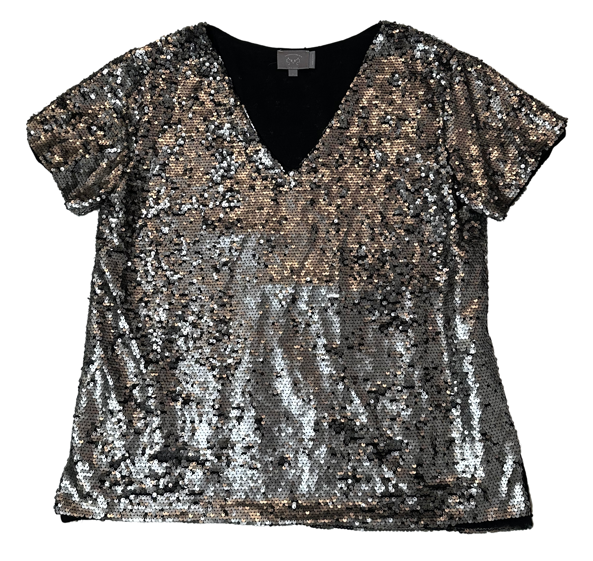 Shimmer and shine in this fully lined Vanessa Virginia Anthropologie silver sequin top. With a flattering V-neck, this short sleeve top will be your go-to for adding a touch of sparkle to any outfit. Perfect for a night out or a special occasion, you'll be sure to stand out and turn heads in this glimmering piece. (Sorry, no disco ball included!)