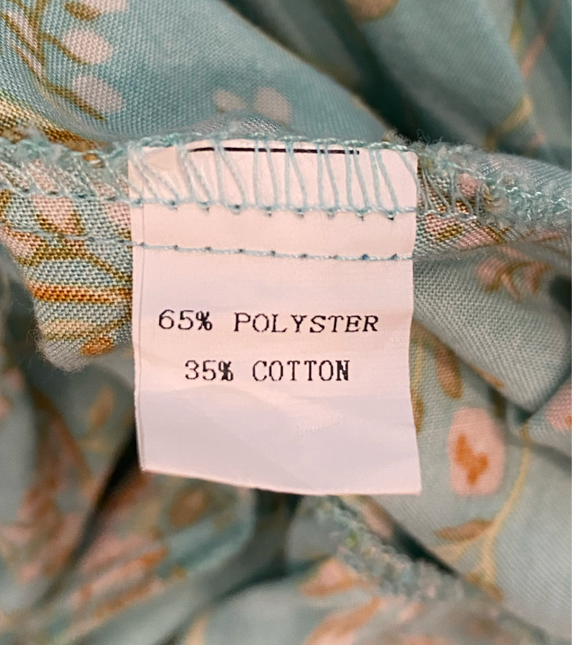 Green wrap dress with rust and cream floral print and ruffle hem.